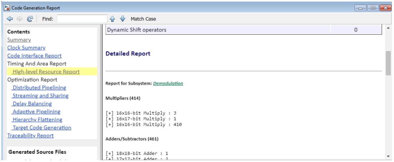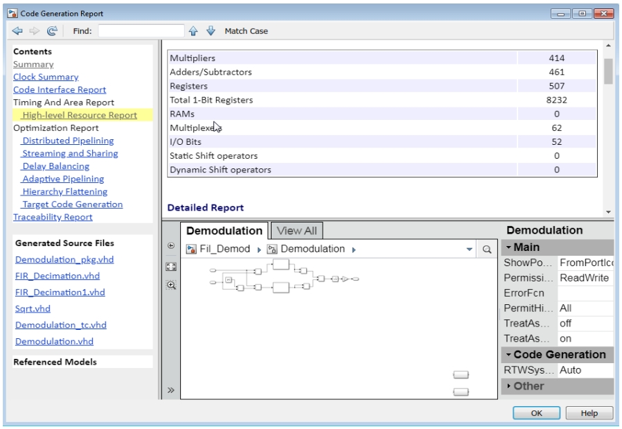 Для генерации HDL-кода для ПЛИС воспользуемся инструментом HDL Workflow Advisor. После завершения генерации HDL-кода будет сформирован отчет, в котором можно посмотреть различную информацию, в том числе и сам HDL-код. Нас же больше интересует отчет о требующихся ресурсах и производительности (рис. 3).