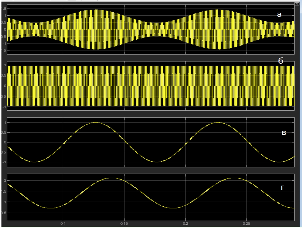Рис. 5. Результаты запуска симуляции с использованием FPGA-in-the-Loop: а – модулированный сигнал, б – сигнал несущей частоты, в – передаваемый сигнал, г – демодулированный сигнал.