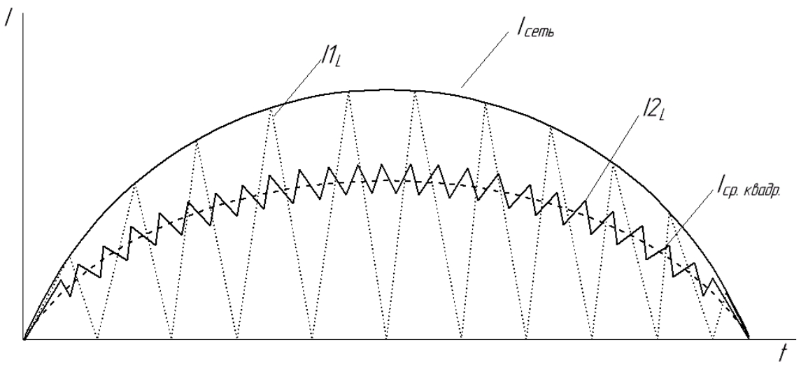 Рис. 2. Форма потребляемого от сети тока (Iсеть – ток сети, I ср. квадр. – среднеквадратичное значение тока в сети, I1L – ток дросселя L в режиме критической проводимости, I2L – ток дросселя L в режиме непрерывных токов).