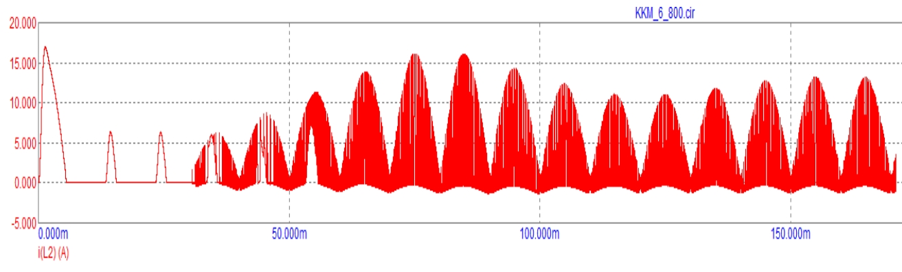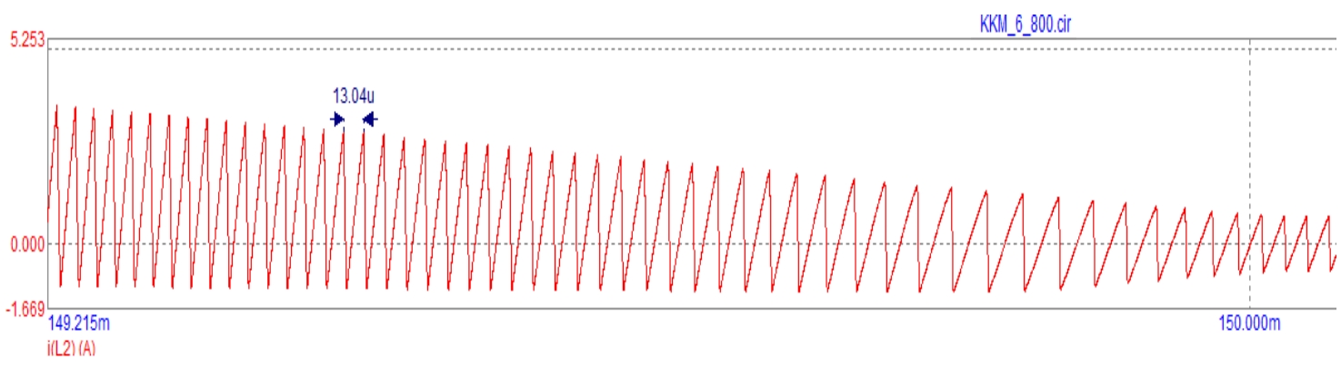 На рисунке 5 показана осциллограмма тока, протекающего через дроссель. В начальный момент времени работы ККМ, МОП транзистор закрыт, микросхема стартует, плавно увеличивая частоту следования импульсов, через дроссель начинает протекать ток. После того как частота импульсов, поступающих на транзистор стабилизируется, на выходе узла ККМ устанавливается значение напряжения +400 В, форма сетевого тока становится синусоидальной, коэффициент мощности – максимальным. Следует заметить, на графиках (рис. 4, 5) показано, что с увеличением длительности импульса (рисунок 6), подаваемого на транзистор, увеличивается выходное значение напряжения, а также ток в дросселе нарастает до большего пикового значения. При уменьшении длительности импульса (рис. 6), выходное значение напряжения уменьшается и ток в дросселе соответственно имеет меньшее пиковое значение.