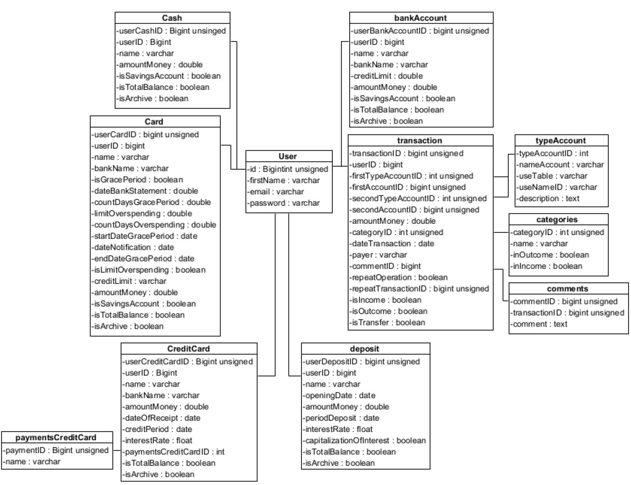 ссылки не найден.«User» связана отношением «один-ко-многим» по полю «userID» с Ошибка! Источник ссылки не найден.«Cash», «Card», «CreditCard», «bankAccount», «deposit» и «transaction». Ошибка! Источник ссылки не найден.«CreditCard» связана отношением «один-к-одному» по полю «paymentID» с Ошибка! Источник ссылки не найден. «paymentCreditCard». Ошибка! Источник ссылки не найден.«transaction» связана с Ошибка! Источник ссылки не найден.«comments» отношением «один-к-одному» по полю «commentID».