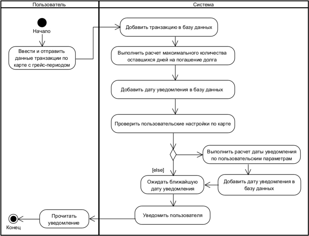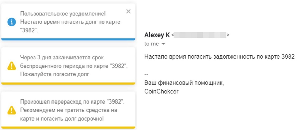 - отправка пользователю системы, являющемуся владельцем кредитной карты с беспроцентным периодом, уведомлений о превышении его бюджета и приближении даты окончания указанного периода;