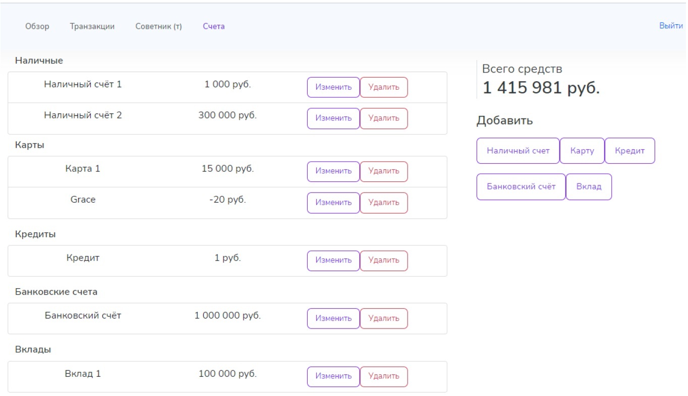 Заключение. Все задачи, поставленные в рамках данного исследования, были решены. Результатом работы является разработанное веб-приложение, предназначенное для персонального учёта и анализа динамики движения денежных средств физического лица, функционал которого, в отличие от аналогичных систем, помимо стандартных включает следующие возможности: