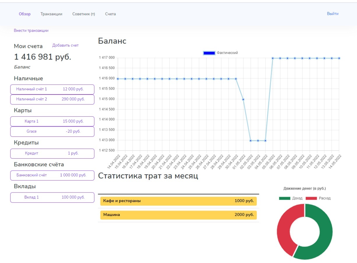 После успешной авторизации пользователя в системе, он должен будет добавить хотя бы один счет на странице «Счета» (рис. 4). После добавление счетов, участвующих в персональном денежном обороте, пользователь может перейти к добавлению транзакций. Для этого ему необходимо перейти на страницу «Транзакции» (рис. 5) и нажать на кнопку, соответствующую виду транзакции: «расход», «доход» или «перевод». Также в системе пользователь имеет возможность просмотреть график, отражающий изменение баланса его средств за последние 30 дней, а также распределение расходов по категориям и отчет по движению средств за текущий месяц с помощью страницы «Обзор» (рис. 6).