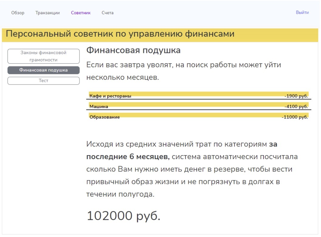 Также, в разработанном веб-приложении пользователям доступен персональный советник по управлению финансами, который находится на странице «Советник». В частности, в текущей версии помощника реализован инструмент, выполняющий анализ расходов пользователей, результатом которого является получение средних значений расходов в каждой из предусмотренных в приложении категорий за последние полгода. Результатом данного анализа является выдача пользователю индивидуальных рекомендаций по формированию финансового резерва на случай возникновения непредвиденных жизненных ситуаций, иначе называемого «финансовой подушкой». Пример того, как может выглядеть подобная рекомендация, приведен на рисунке 7.