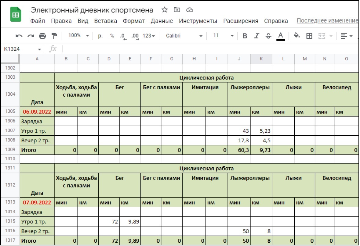 - столбцы таблицы содержат описание разделов спортивной подготовки: циклическая работа, которая включает ходьбу и ходьбу с палками, бег и бег с палками, прыжковую имитацию лыжных ходов с палками, тренировка с использованием лыж, лыжероллеров, велосипеда; спортивные игры; силовая подготовка, которая включает силовую работу на лыжах, лыжероллерах и в тренажерном зале; строки таблицы содержат информацию о количестве пройденных километров и затраченном времени по каждому разделу на зарядке, утренней и вечерней тренировках; в конце каждого тренировочного дня ведется подведение итогов проделанной спортсменом работы (рис. 1, 2);