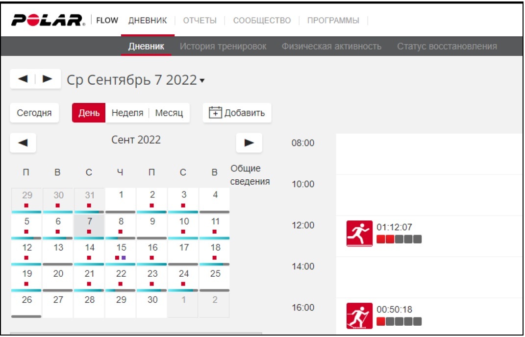 Включение пульсометра производится в момент начала тренировки, а отключение – после ее завершения. При этом после синхронизации датчика и пульсометра в приложении Polar Flow [4] появляется вся информация о ходе тренировочного процесса. Например, на рисунке 6 видно, что 07.09.2022 г. у спортсмена было две тренировки – утренняя и вечерняя.