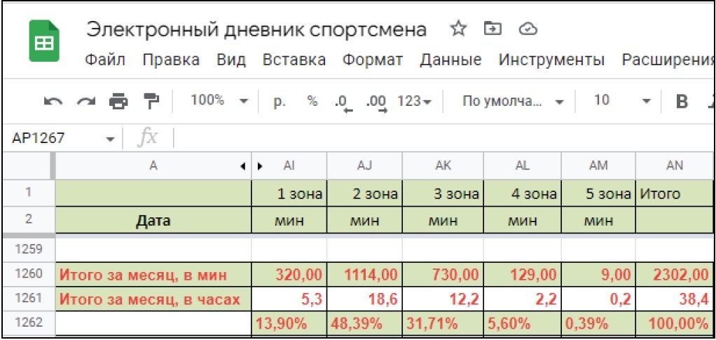 В конце каждого месяца подводятся итоги по каждому виду работы. Например, итоговые значения о работе в различных зонах интенсивности за месяц представлены на рисунке 9.