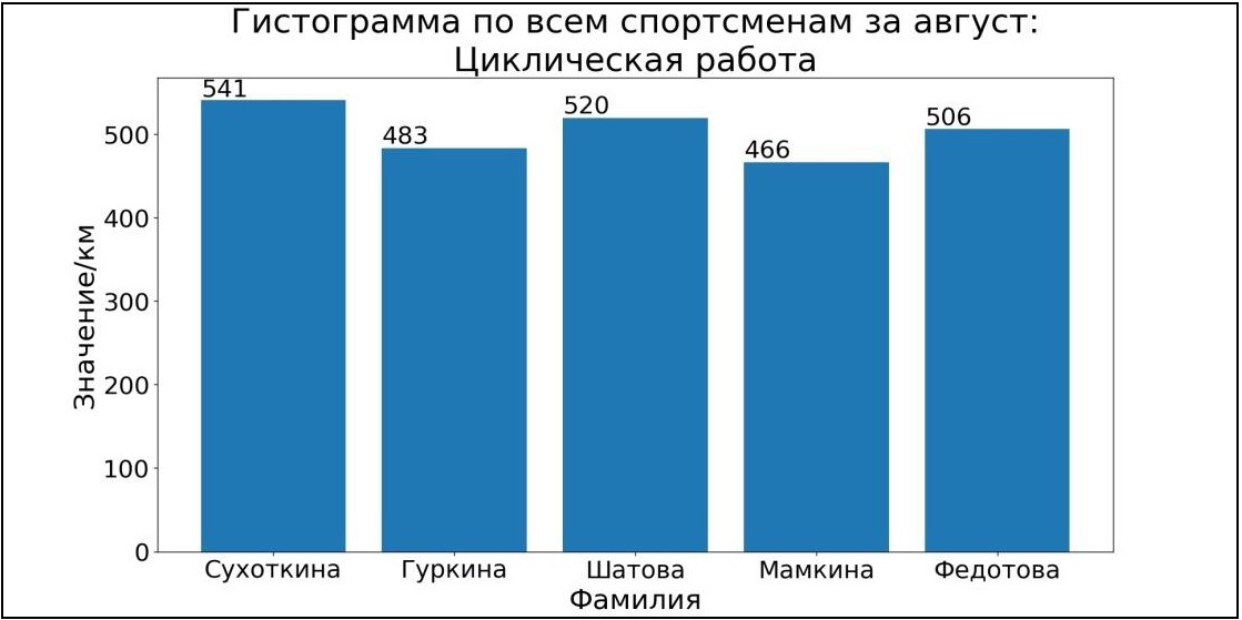 Рис. 16. Объемы циклической работы спортсменов за месяц.