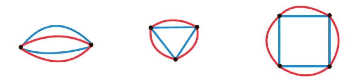 На рисунке 1 приведены примеры простейших двуцветных графов; в силу определения двуцветного графа (он не содержит петель) минимально возможный двуцветный граф состоит из 2 вершин и 4 соединяющих их ребер.
