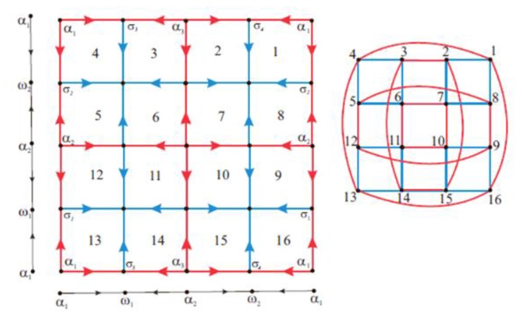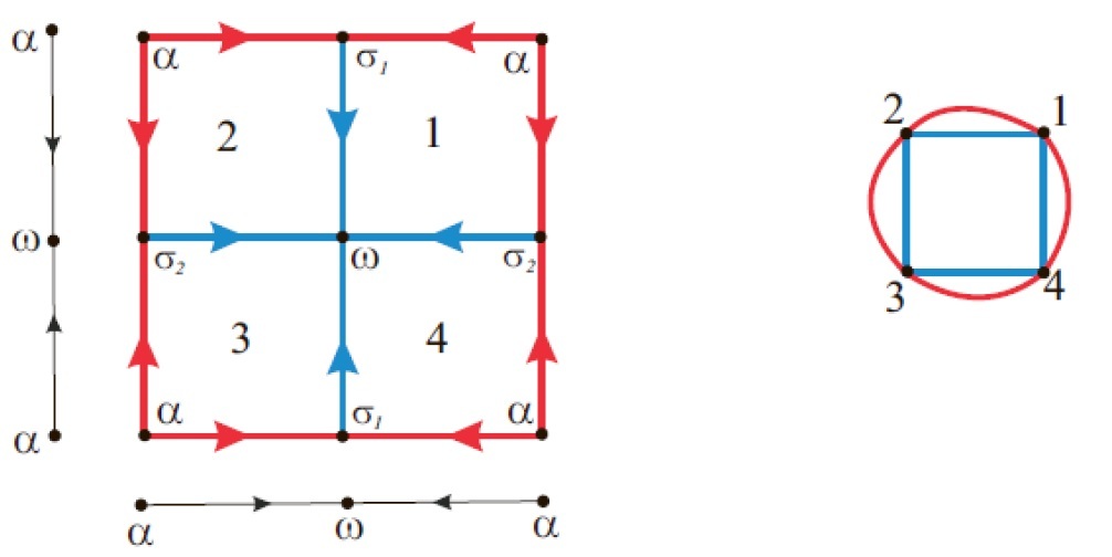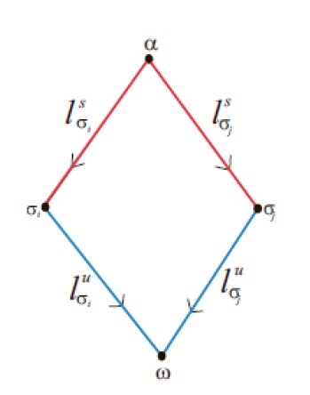 В границу каждой ячейки 𝛿 входят четыре периодические точки: источниковая точка 𝛼, седловые точки σᵢ и σⱼ , стоковая точка 𝜔, а также устойчивые сепаратри и (s – кривые) с граничными точками 𝛼, 𝜎ᵢ и 𝛼, 𝜎ⱼ , неустойчивые сепаратрисы и (u-кривые) с граничными точками 𝜔, σᵢ и σⱼ , 𝜔 (см. Рис. 2). Стороной ячейки назовем замыкание s- или u-кривой.