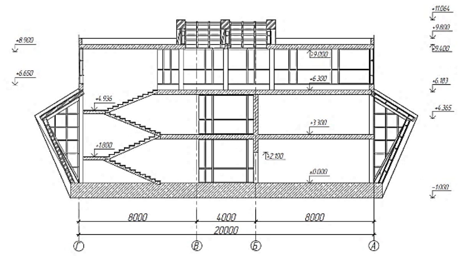 Проектируемым объектом является трехэтажное офисное здание сложной формы. На первом и втором этажах располагаются офисные помещения, которые имеют типовую планировку и выполнены по технологии «Open Space». Третий этаж предназначен для конференц-зала. Входные группы включают тамбур и помещение для охраны. Для сообщения между этажами здания предусмотрены лестничные клетки. Высота здания до наивысшей отметки конструктивного элемента составляет +11,064 м. Высота этажей равна 3,000 м. В плане здание представляет собой квадрат. Размеры здания в осях А – Г и 1 – 4 составляют 20,000 м.
