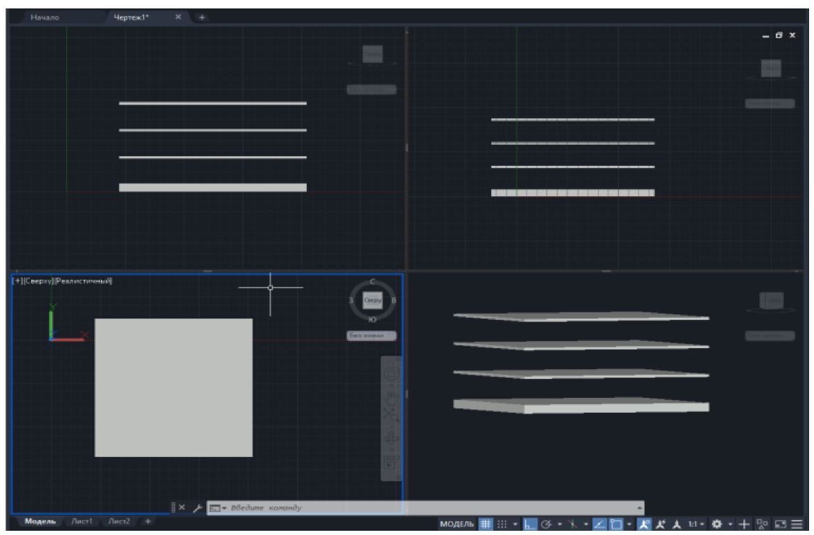 Для 3D-моделирования объекта в AutoCAD 2020 удобнее всего вывести несколько видовых экранов. На них можно выстроить разные визуальные стили (реалистичный, концептуальный, каркас, скрытый, эскизный и др.) и виды для проектирования будущего здания (вид спереди, слева, справа, изометрическую поверхность и др.). Архитектурное моделирование офисного здания (от создания типового этажа до реалистичной модели объекта) выполняется согласно определенной технологической последовательности [3–5].