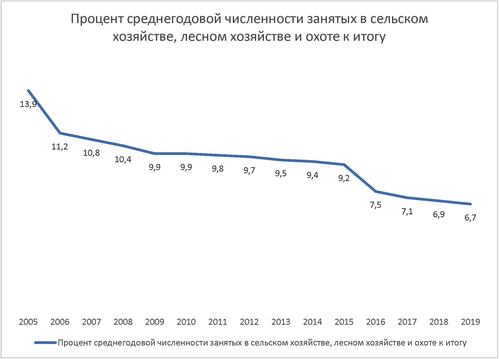 Рис. 2. Изменение среднегодовой численности занятых в сельском хозяйстве, лесном хозяйстве, охоте на период 2005-2019 гг. (в процентах к итогу) [составлено В. Г. Задковым на основе 9].