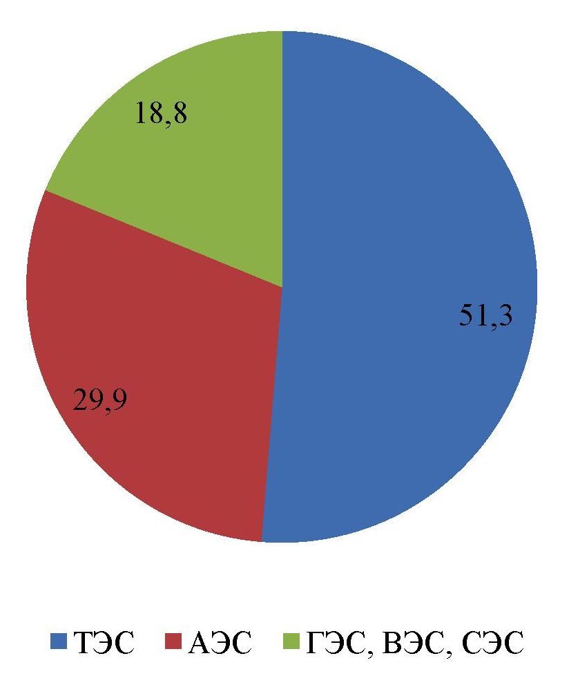Рис. 1. Структура выработки электроэнергии в ОЭС Средней Волги в 2021 г., в % [составлено по источнику 3].
