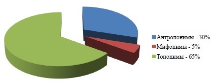 По определению Д. Э. Розенталя и М. А. Теленковой, фразеологическая единица (фразеологизм, фразеологический оборот) – это лексически неделимое, устойчивое в своем составе и структуре, целостное по значению словосочетание, воспроизводимое в виде готовой речевой единицы [14]. В соответствии с классификацией И. Л. Кучешевой [6], по лексическому значению были выделены фразеологизмы, в состав которых входят антропонимы, топонимы, мифонимы.