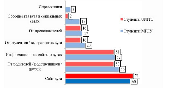 Рис. 3. Источники информации о вузе, которыми пользовались студенты МГЛУ и UNITO, %