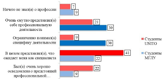 Несмотря на схожесть источников информации о вузе и о специальности, полнота полученной информации различна (см. рис. 4). Так, студенты Туринского университета более полно понимали, в чем заключается специфика выбранной профессии, более 62% студентов говорят о том, что достаточно в полной мере представляли, что ожидает во время обучения на данной специальности, а также после окончания вуза. В свою очередь, студенты МГЛУ не совсем четко понимали, в чем заключается специфика их будущей профессиональной деятельности.