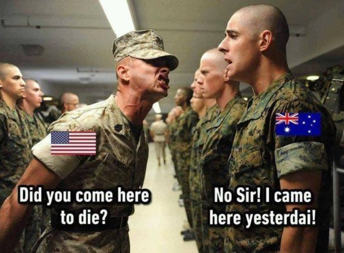 Комичность ситуации во многих англоязычных интернет-мемах может быть создана с помощью фонетической языковой игры, то есть игры на созвучии. В интернет-пространстве наиболее частотными являются мемы, в которых сравниваются американский и британский английский. Вызывает интерес пример различия в произношении австралийского от привычного нам американского английского (рис. 1). Солдат, владеющий американским английским, спрашивает другого “Did you come here to die?” (пер. Ты пришел сюда умереть?), на что австралиец отвечает “No Sir! I came here yesterday!” (пер. Нет, Сэр! Я пришел сюда вчера!). Недопонимание происходит на почве специфики характерного произношения двух видов диалекта английского языка. Американская речь характеризуется небрежностью и резкостью, а также является сама по себе очень импульсивной и быстрой – отсюда американцы часто проглатывают конец слов или предложений. В это же время, австралийцы очень спокойны во время разговора и предпочитают мелодичность речи. Поэтому австралийский солдат вместо нужного «to die» (умереть), услышал «today», что переводится как «сегодня». Именно фонетические особенности диалектов, основанные на различиях акцентов английского, сделали эту ситуацию комичной.