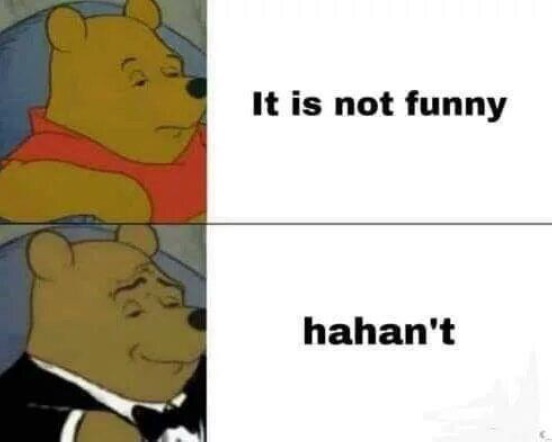 Интерес вызывает интернет-мем основанный на грамматическом аспекте языка (рис. 2). В первую очередь нужно выделить визуальную часть мема: нам представлен вид мема, где картинка представляет собой шаблон. На картинках изображен Винни-Пух, однако на каждой он представляется нам в разном обличии. На первой картине медведь показан в привычном нам виде, соответственно, отражая обыденность и естественное положение вещей. На втором изображении нам представлен Винни-Пух в смокинге, отражая элитарность и свое интеллектуальное превосходство. Обращаясь к грамматике английского языка, мы знаем, что отрицательная форма вспомогательного глагола формируется с помощью прибавления к начальной форме глагола частички «not» или же её сокращение «n’t». Таким образом, в обычной жизни мы бы ответили, как первый Винни-Пух – “It is not funny” (пер. Это не смешно), но если бы мы хотели выразиться более «остроумно», то вероятно сказали бы как второй медведь – “hahan’t”. Таким ответом мы «отрицаем» смех, добавляя к нему частичку «not» в сокращенном варианте, придавая ситуации ироничный оттенок.