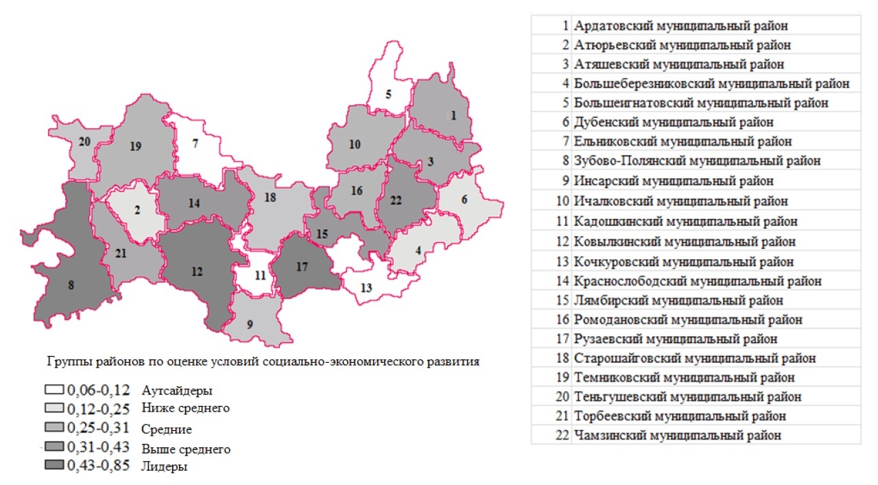 Количественные значения, формализовано выражающие условия и ресурсы социально- экономического развития муниципальных районов Республики Мордовия отражены на рисунке 3.