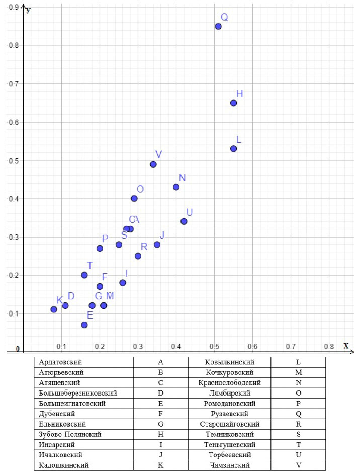 На координатной плоскости представлена матрица, выражающая картину перспективных территорий социально-экономического развития Республики Мордовия. Атюрьевский район (В) и Кочкуровский район (М) занимают одну и ту же точку на данной координатной плоскости, поскольку имеют одинаковые низкие показатели: ресурсы развития – 0,21; условия развития – 0,12. Минимально низкие значения у Большеигнатовского муниципального района. Можно сделать вывод, что перспективы развития этих муниципальных районов выражены слабо.