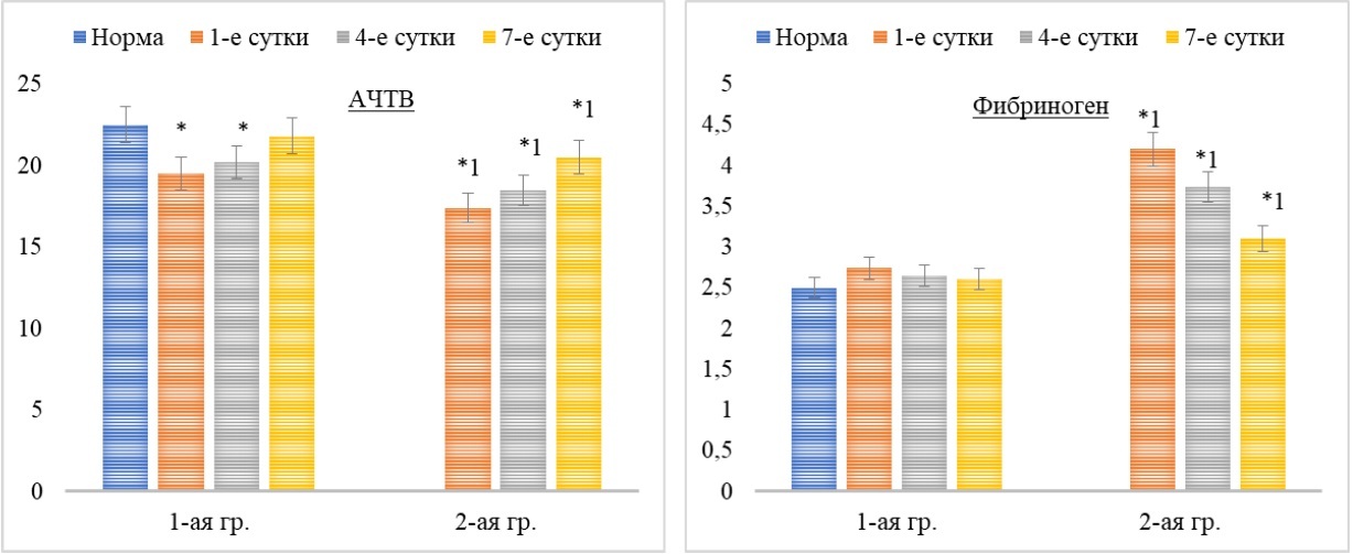 Тест активности системы гемостаза показал изменения у изучаемых пациентов со стороны свертывающей и фибринолитической активности. В группе сравнения величина АЧТВ была сокращена относительно исходного значения на 1-е и 4-е сутки на 16,8 и 13,5 % (p <0,05) соответственно. Содержание фибриногена в этой группе превышало норму незначительно в первые четверо суток.