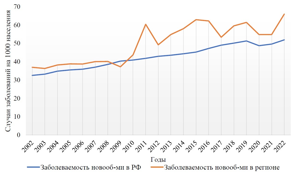 В ходе сравнительного анализа заболеваемости населения в регионе и в России за период 2002-2022 гг. выявлена склонность к росту показателя повсеместно, однако региональная заболеваемость превышает таковую в среднем по стране. Явный пик приходится на 2011 год, когда разница между региональными и федеральными показателями составила 44,5% – 60,4 и 41,8 на 1000 населения соответственно (табл. 1).