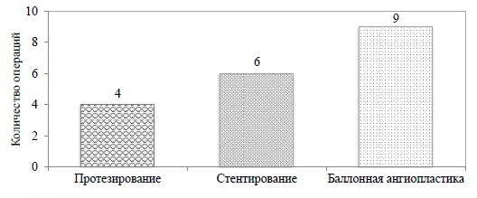 Начиная с 2015 года больным с СДС стали системно проводить реконструктивные сосудистые операции, позволяющие в ряде случаев восстановить адекватный артериальный кровоток. В 2019 году выполнено 19 операций, характер которых представлен на рисунке 2.