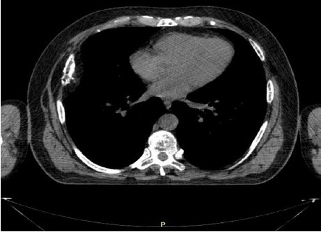 Рис. 1. Разрушение кортикального слоя 6 ребра справа при компьютерной томографии грудной клетки