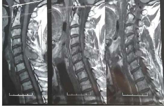 Рис. 2. Экстрадуральное образование на уровне С5 позвонка с прорастанием в спинномозговой канал при магнитно-резонансной томографии шейного отдела позвоночника