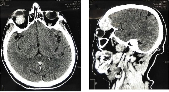 Рис. 3. Мягкотканое образование в орбите глаза слева при компьютерной томографии