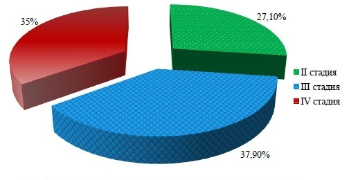 При стадировании рака желудка по системе TNM у 102 (72,9%) больных выявлялись III и IV стадии опухолевого процесса (рис. 1). Отсутствие больных с I стадией рака желудка в очередной раз свидетельствовало о не настороженности населения, несовершенстве и/или не достаточном объеме применения диагностических технологий, что является предметом отдельной дискуссии.
