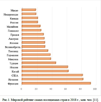 Рис.1. Мировой рейтинг самых посещаемых стран в 2018 г., млн. чел. [11].