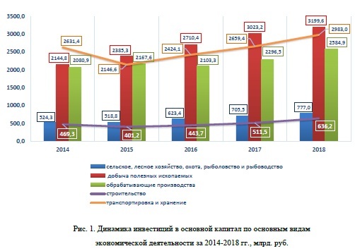 Рис. 1. Динамика инвестиций в основной капитал по основным видам экономической деятельности за 2014-2018 гг., млрд. руб.