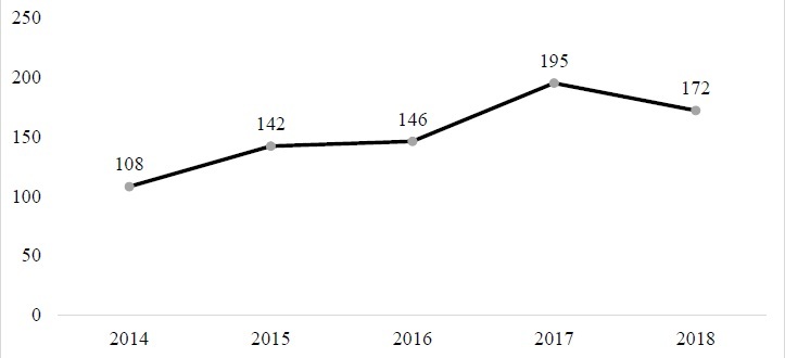 Рис. 1. Динамика впервые выявленных ВИЧ-инфицированных в Республике Мордовия за период 2014-2018 гг., чел.