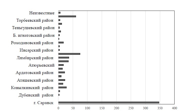 По количеству ВИЧ-позитивных пациентов в Республике Мордовия лидирует г. о. Саранск (зарегистрировано 347 новых случаев ВИЧ инфекции за период с 2014–2018 гг.). Далее следует Рузаевский район (85 случаев за тот же период). Третье место занимает Лямбирский район (60 выявленных инфицированных вирусом с 2014–2018 гг.). За 5 лет появились районы, которые ранее не фигурировали в официальных отчетах «Мордовского республиканского центра по профилактике и борьбе со СПИД и инфекционными заболеваниями» до настоящего времени. К ним относятся Торбеевский, Теньгушевский, Атюрьевский, Краснослободский районы (см. рис. 2).