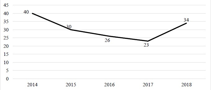 Анализируя показатель родов у ВИЧ-инфицированных женщин, мы выявили, что в 2014 году было зафиксировано 40 случаев. Затем на протяжении 3-х лет их число снизилось. Однако в 2018 году этот показатель увеличился с 23 до 34 случаев (см. рис. 5).