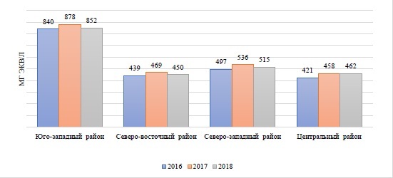 При норме 7 мг экв/л, показатель общей жесткости превышает норму в Юго-Западном и Северо-Западном районах г. Саранска. В 2016 г. ее уровень составил 10 мг экв/л, в 2017 г. 9,5 мг экв/л, в 2018 г. 8,5 мг экв/л в Юго-Западном районе города, что выше нормы на 21-42%; в Северо-Западном районе на 10-21% выше нормы (см. рис.2).