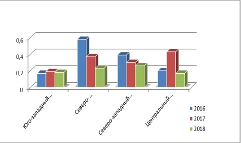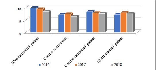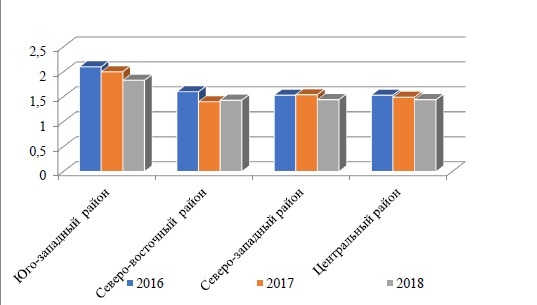 При анализе содержания бора в воде мы наблюдаем, что во всех районах города он равен верхней границе нормы, за исключением Юго-Западного района, где превышение нормы на 40-60%, практически в 2 раза по сравнению с другими районами за исследуемый период 2016-2018 гг. (см. рис.5).