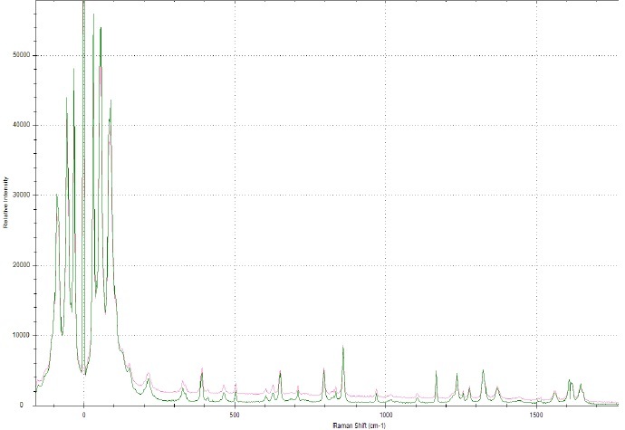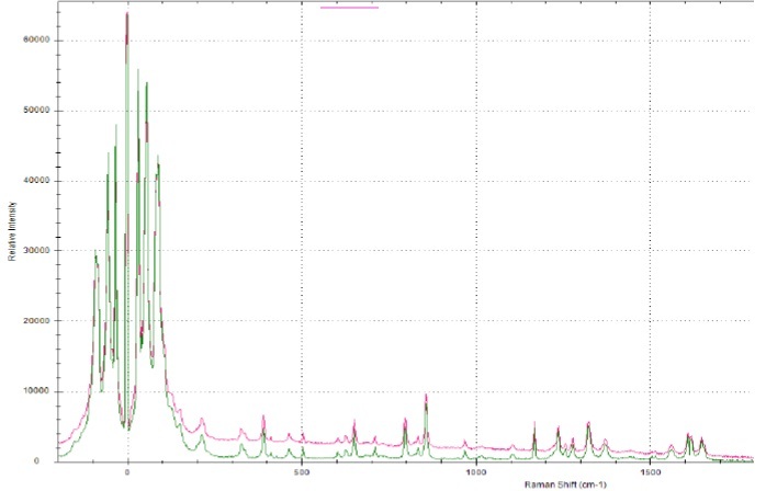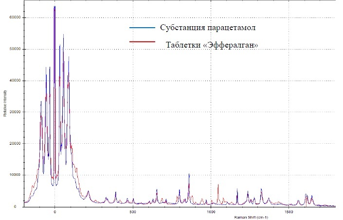 Для исследуемых объектов были индивидуально подобраны параметры анализа: мощность лазерного излучения 100 мВт и продолжительность записи спектральных данных. Представленные на рисунках 1–6 спектры комбинационного рассеяния представляют собой средние спектры объектов, полученные по результатам трех последовательных измерений. Анализ объектов исследования проводили при помощи аналитической системы комбинационного рассеяния света ОРТЕС-785TRS-2700. В целях возможности визуальной идентификации активной фармацевтической субстанции в составе многокомпонентных объектов на каждый из спектров анализируемого лекарственного препарата был наложен спектр комбинационного рассеяния чистой субстанции парацетамола.