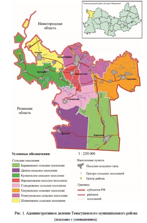 Теньгушевский район – административно-территориальная единица и муниципальное образование (муниципальный район) в составе Республики Мордовия Российской Федерации. Район находится на северо-западе Республики Мордовия, гранича с Темниковским и Зубово-Полянским районами и с Нижегородской и Рязанской областями (см. рис. 1). В Теньгушевский муниципальный район входят 8 муниципальных образований со статусом сельских поселений. Состав муниципального деления района представлен в таблице 1.