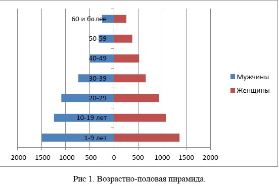 Если взять наиболее трудоактивное население, которое включает в себя 4 возрастные группы от 10 до 49 лет, то процентное соотношение от общего числа составляет примерно 60%. Также стоит отметить, что сохранялся баланс между мужской и женской частью населения среди возрастных групп. Для более наглядного примера (на основе численности калмыков) мы составили возрастно-половую пирамиду, объединив 1 и 2, 8 и 9 группы (см. рис. 1). Данная пирамида относится к прогрессивному типу, для которой характерен высокий естественный прирост населения, большое количество молодых людей и низкая доля пожилых [1].
