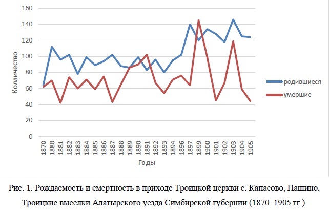 Рис. 1. Рождаемость и смертность в приходе Троицкой церкви с. Капасово, Пашино, Троицкие выселки Алатырского уезда Симбирской губернии (1870–1905 гг.).