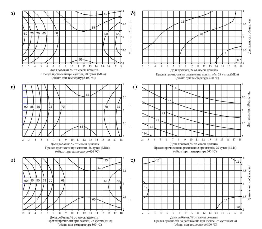 Целью данной работы являлось исследование влияния параметров обжига (температуры, длительности) и дозировки термоактивированной глины на прочностные характеристики цементного камня – пределы прочности при сжатии и на растяжение при изгибе в возрасте 28 суток.