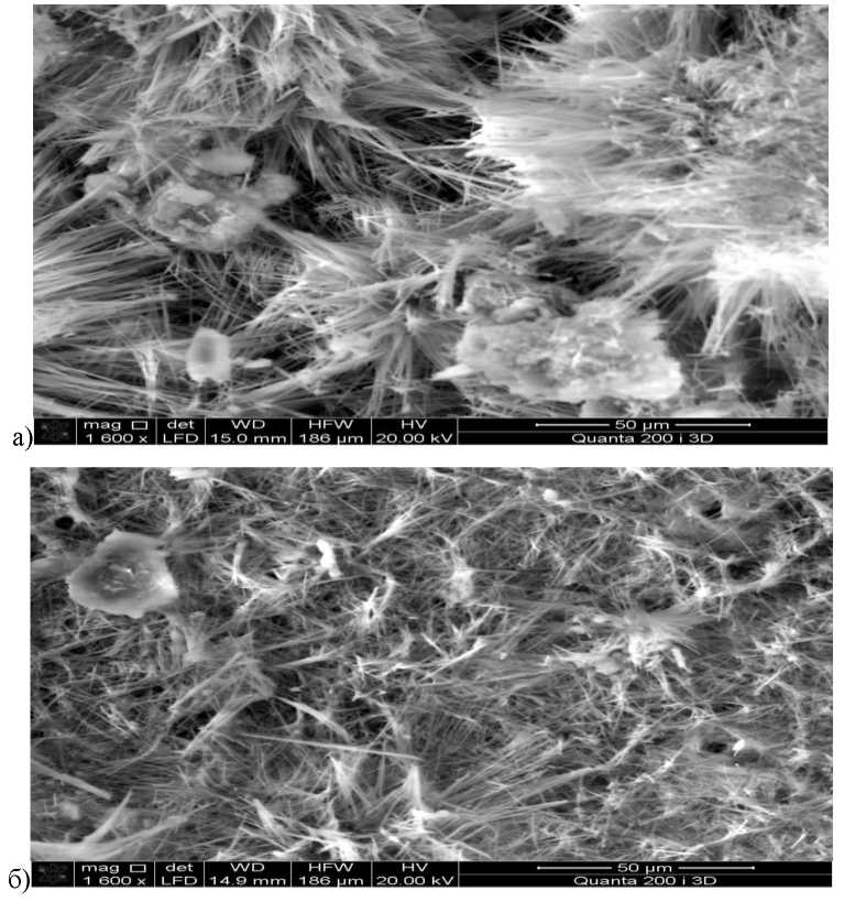 Рис. 4. Структура осадка цементного камня, наполненного ЦСП: а) 10 %, б) 30 %, полученная на многофункциональном растровом электронном микроскопе с интегрированной системой фокусированного ионного пучка Quanta 200i 3D FEI при увеличении х1600.