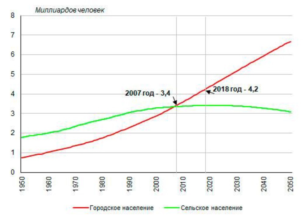 Рис. 1. Численность городского и сельского населения мира, 1950-2050 годы [8]