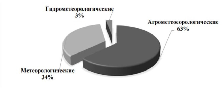 На территории Республики Мордовия за 27 лет (с 1994 по 2019 гг.) зафиксировано 39 видов опасных природных явлений, общей продолжительностью 3153 дня. При этом основную их часть составляют агрометеорологические и метеорологические и лишь малую долю гидрометеорологические (рис. 1), а среднее количество дней, сопровождающееся опасными метеорологическими явлениями, и количество видов явлений по районам Республики Мордовия можно рассмотреть на рисунках 2 и 3.