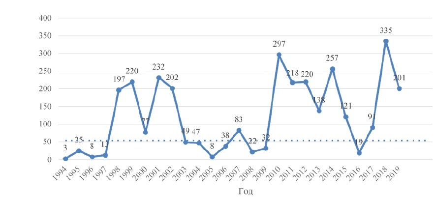 Увеличение случаев опасных гидрометеорологических явлений на территории Республики Мордовия вызвано возросшей частотой стационарных антициклональных процессов [2]. На этом фоне актуальной выглядит проблема своевременного прогнозирования опасных природных явлений в целях снижения риска их воздействия на отрасли экономики региона, окружающую природную среду жизнь и здоровье людей.