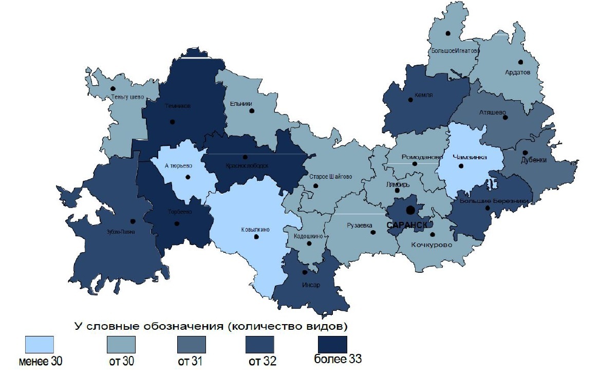 В целом, применительно к территории Мордовии разброс количества проявления опасных гидрометеорологических явлений невелик, и в административных районах отмечаются близкие показатели [4]. Как видим, наибольшее число зарегистрированных опасных гидрометеорологических явлений (более 33) характерно для трех районов республики – Краснослободского, Темниковского и Торбеевского (рис. 1), что может быть объяснено приуроченностью большей части населенных пунктов этих районов (включая сам районные центры) к берегам и долине крупнейшей реки региона – Мокши и ее главных притоков.